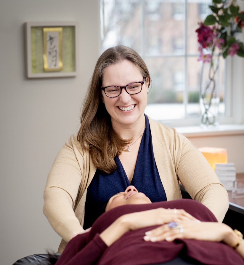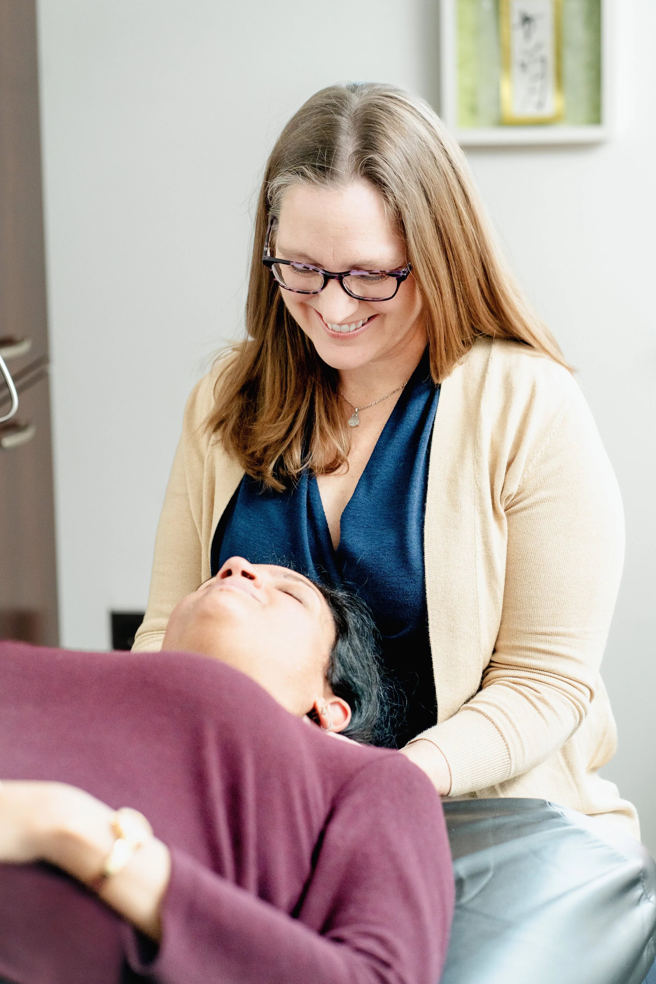 Using her palpation and visual inspection, Dr. Patterson evaluates for structural asymmetry, tenderness, restricted motion, and tissue texture changes.